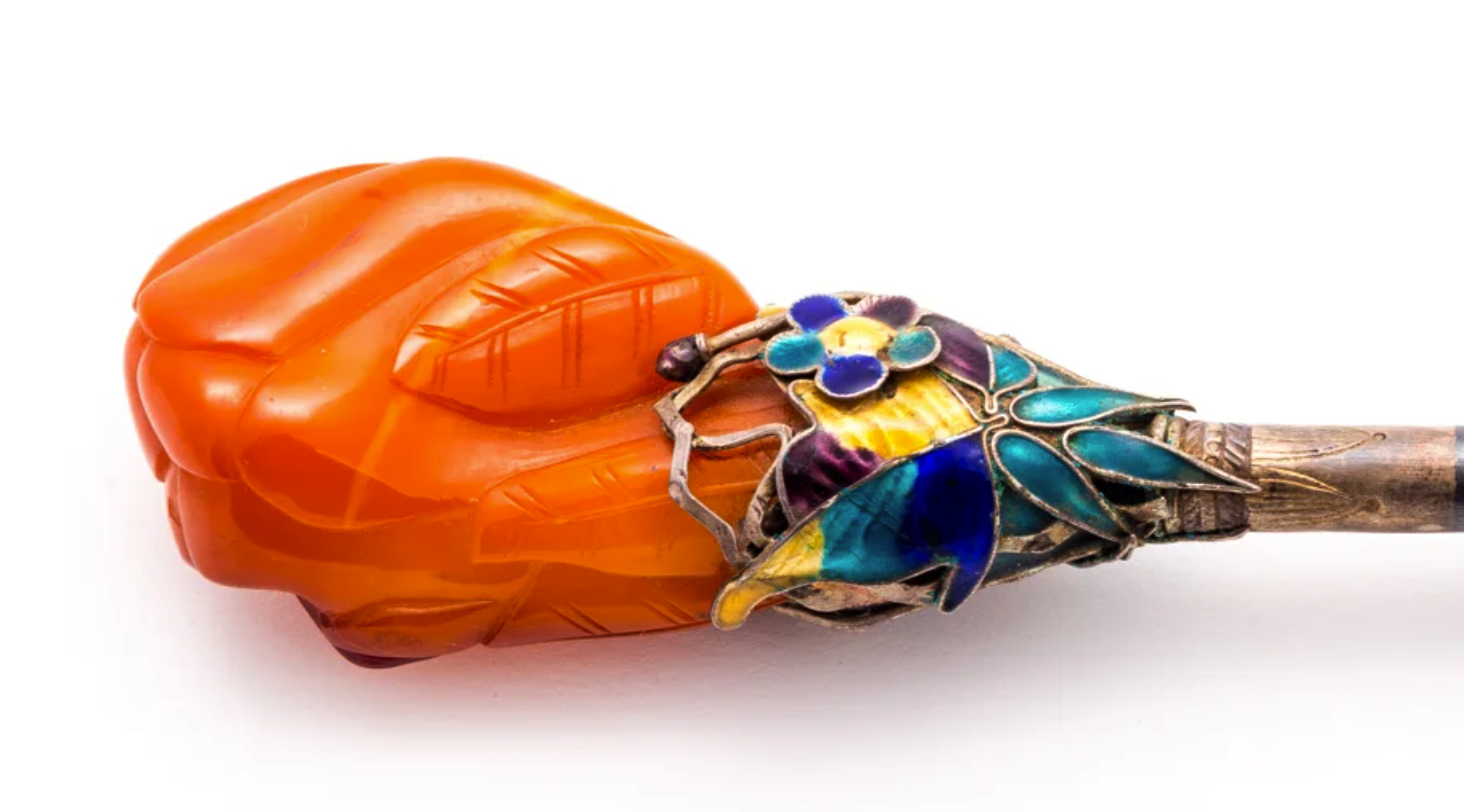 An exhibition of a different sort, Vibrant Embellishments centers not on a variety of featured stones, but rather how they are presented: shell and enamel in jewelry, functional metalwork and hollowware set in silver, copper, and gold.